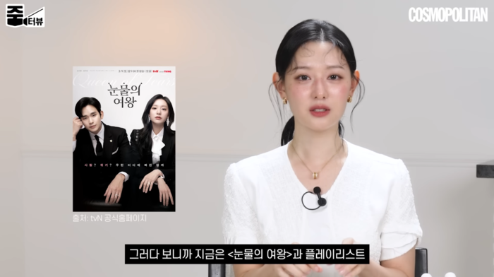 19일 공개된 유튜브 채널 ‘COSMOPOLITAN Korea’의 ‘눈물의 여왕 홍해인 본캐, 김지원! 알고 보니 애교 많은 깜고잖아요?’ 영상에는 김지원이 출연해 인터뷰 질문에 답했다.