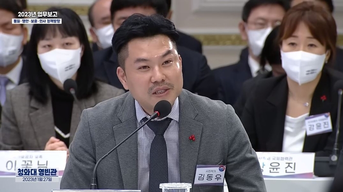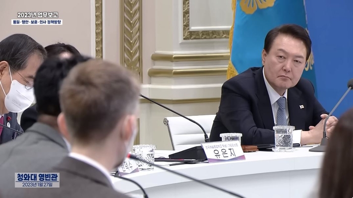2023 국가보훈부 업무보고 자리에서 김동우 작가의 발언을 듣고 있는 윤석열 대통령/국가보훈부 유튜브 갈무리