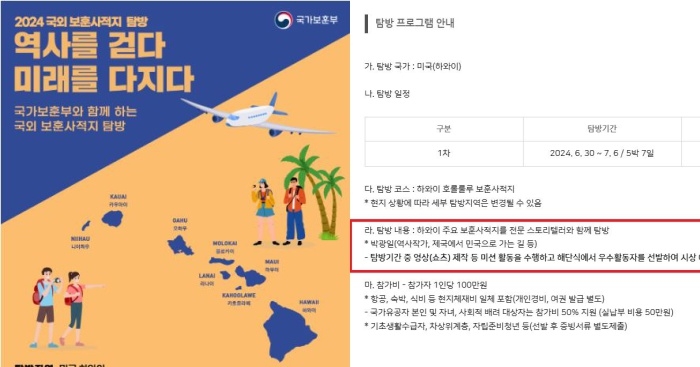올해 6월 30일 출발하는 하와이 탐방은 총 110명의 참가자를 모집한다. 관광이 아닌 독립운동 사적지 탐방이 목표임에도 이들에게 하와이 사적지를 설명할 전문 강사는 1명이 배정됐다. 취재가 시작된 후 보훈부는 현지 전문가 2명을 이미 섭외했다고 밝혔다. 하지만 홍보 포스터에는 해당 내용이 나와 있지 않다. 김 작가를 배제할 만큼 현지 전문가가 독립운동 관련 지식을 갖추고 있는지, 110명의 참가자에게 제대로 정보 전달을 할 수 있는지도 미지수다.
