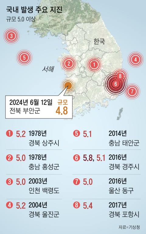 12일 오전 8시 26분 규모 4.8의 지진이 발생한 전북 부안. 규모 4.8은 올해 들어 한반도에서 발생한 가장 강한 지진이다. 서해안 지역인 부안에서 4.0 이상 강진(强震)이 발생한 것은 이날이 처음이었다.