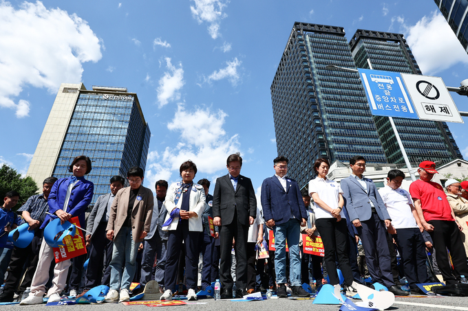 이재명 더불어민주당 대표를 비롯한 당직자들이 1일 서울 중구 서울역 인근에서 열린 더불어민주당 '해병대원 특검법, 국민이 승리한다' 윤석열정권 규탄 및 해병대원 특검법 관철을 위한 범국민 대회에서 해병대원 채상병을 위한 묵념을 하고 있다. 뉴시스