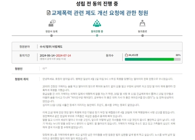 해당 청원은 이날 기준 4만 4000명이 넘는 동의를 얻었다. 청원 공개 이후 30일 이내 청원 성립 요건인 5만명 이상의 동의를 얻으면 국회 소관위원회에 넘겨져 관련 법 개정 논의를 이어가게 된다.