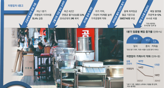자영업자들은 코로나19 엔데믹(감염병의 풍토병화)에 따른 기저효과는 사실상 사라진 가운데 △고금리에 따른 이자부담 증가 △고물가로 지갑 닫는 소비자 △저가품 위주의 출혈경쟁 △최저임금 인상으로 인건비 증가 △배달 플랫폼 수수료 부담이라는 5중고로 출구 없는 터널을 지나가고 있다.