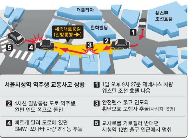 다른 가게 주인도 “역주행하는 차량을 그동안 많이 봐왔다”며 “과거에는 이 길의 한 차선은 시청역 쪽(세종대로)으로 나갈 수 있게 돼있었다”고 설명했다. 해당 도로는 2005년 보행로개선사업으로 양방통행에서 일방통행으로 바뀌었다.