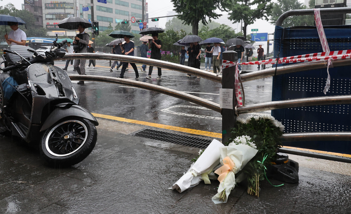 전날 밤 서울 시청역 인근 교차로에서 차량돌진으로 9명이 사망하고 4명이 부상당하는 사고가 발생한 가운데 2일 사고 발생 지점인 서울 시청역 교차로 인근에 희생자를 추모하는 국화꽃이 놓여 있다. [이충우 기자]