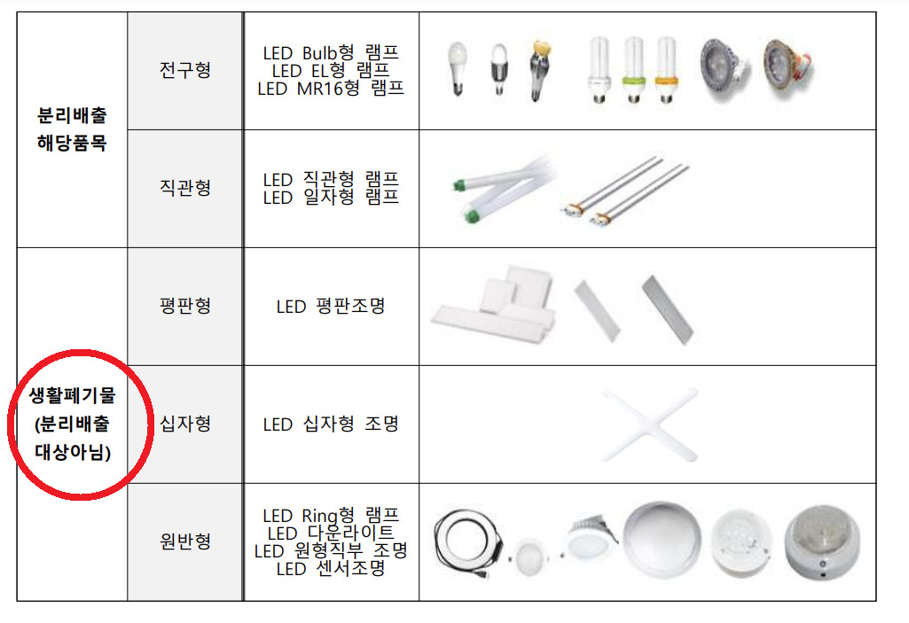 문제는 업계의 반발이었다. 결국, LED 조명 중 전구형과 직관형 LED만 재활용 품목이 됐고, 정작 가정에서 대부분 쓰이는 평판형 LED 등은 제외됐다. 전구형이나 직관형은 기존 형광등처럼 교체해 사용하는 형태이고, 요즘 집안에서 주로 쓰는 LED 등은 평판형이나 십자·원반형 형태다.