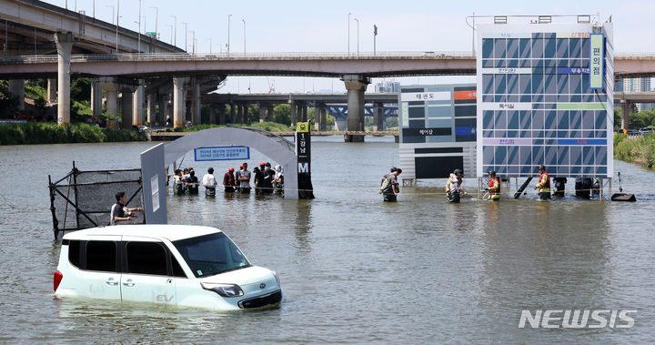 [서울=뉴시스] 김금보 기자 = 31일 오후 서울 송파구 탄천공영주차장 수변 일대에서 열린 '2024년 강남구 안전한국훈련'에서 소방대원들이 강남역, 반지하, 전기차 등 도심호우·침수피해 발생 상황을 가정한 긴급구조훈련을 하고 있다.