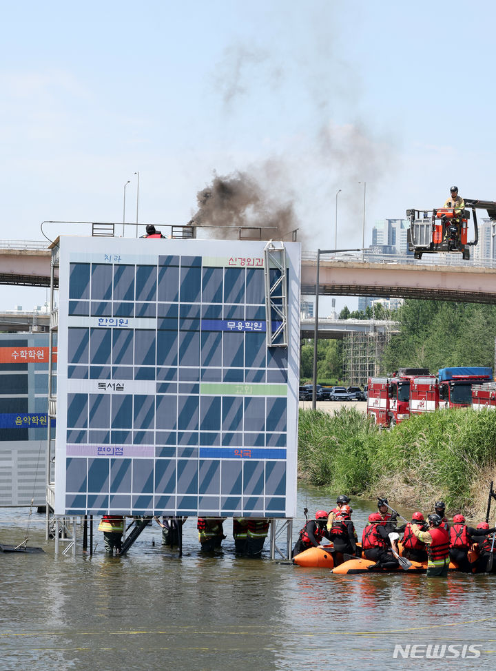 [서울=뉴시스] 김금보 기자 = 31일 오후 서울 송파구 탄천공영주차장 수변 일대에서 열린 '2024년 강남구 안전한국훈련'에서 소방대원들이 강남역, 반지하, 전기차 등 도심호우·침수피해 발생 상황을 가정한 긴급구조훈련을 하고 있다. 2024.05.31. kgb@newsis.com
