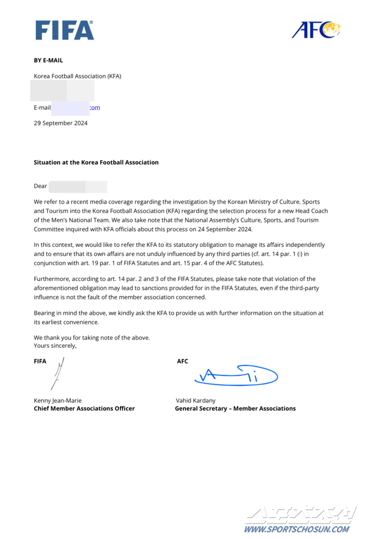 FIFA는 "KFA에 대한 문체부의 감사가 진행 중이고, 국회 문체위 질의도 있었던 사실을 주목하고 있다.
