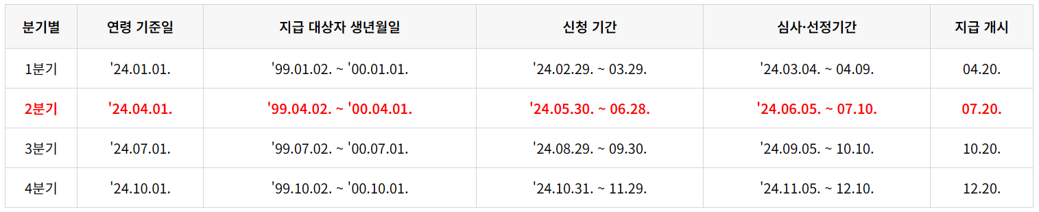 ● 지원 연령조건 : 2024년 기준으로 1999년 1월 2일 ~ 2000년 1월 1일 사이에 태어난 청년입니다.