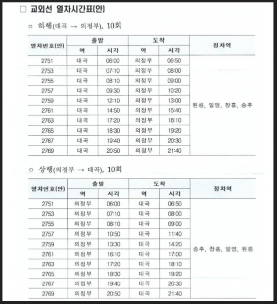 교외선은 재개통 후 평일과 주말 모두 일정한 간격으로 운행될 예정입니다. 아래는 예상 시간표와 요금 정보입니다.