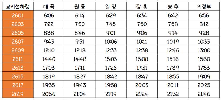 - 역 간 소요 시간: 역 간 소요 시간은 대략 6분에서 16분 사이로 보입니다. 특히 원릉역과 대곡역 사이의 소요 시간이 7분으로 가장 짧습니다. 반면 송추역과 장흥역 사이, 그리고 일영역과 원릉역 사이의 소요 시간이 6분으로 비교적 짧습니다.