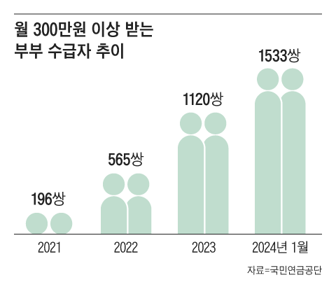 노부부가 국민연금으로 월 300만원씩 받을 수 있다면 노후에 축복일 것이다. 그렇다면 실제 국민연금으로 월 300만원 이상 받는 부부 수급자 수는 얼마나 될까? 국민연금공단에 따르면, 월 300만원 이상 수령하는 연금 맞벌이 부부는 지난 2021년 196쌍에서 작년 말 1000쌍을 돌파했고, 올 1월엔 1533쌍으로 늘었다.