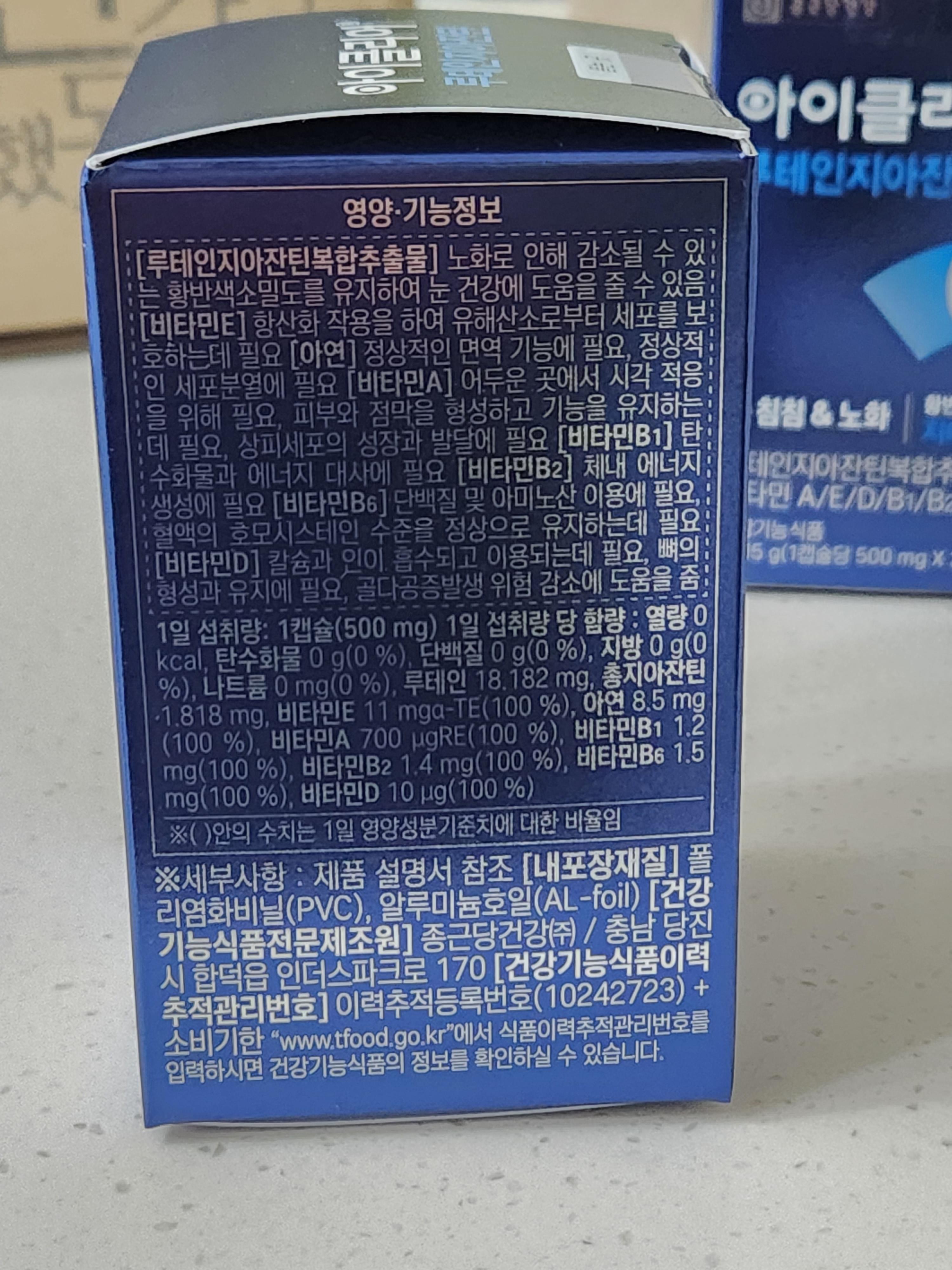 주원료로 루테인지아잔틴 복합추출물, 비타민A, 비타민D, 비타민D, 비타민E, 비타민B1, 비타민B2, 비타민B6, 아연이 함유되었고요.