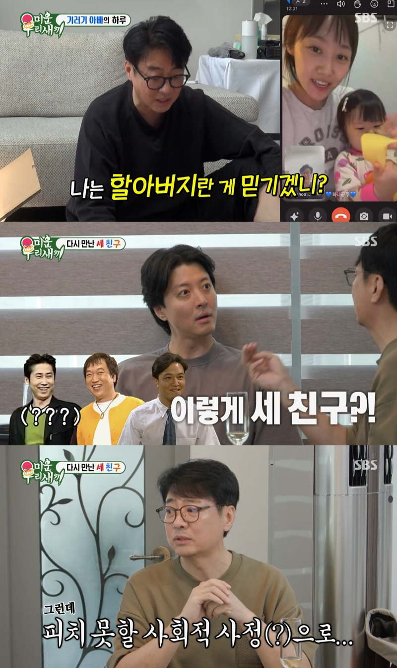 시트콤 '세 친구'의 주역, 코믹 연기의 대가 배우 윤다훈이 '미우새'에서 7년 차 기러기 아빠 일상을 공개했다. 영양제 한 무더기로 아침을 대신한 윤다훈은 손녀에게 영상통화를 걸어 준비한 선물을 보여주며 행복한 대화를 이어갔다. 이어 윤다훈의 집에 이동건이 방문했고, 두 사람은 '세 친구'에서 함께 연기했던 24년 전의 추억을 함께 회상했다.