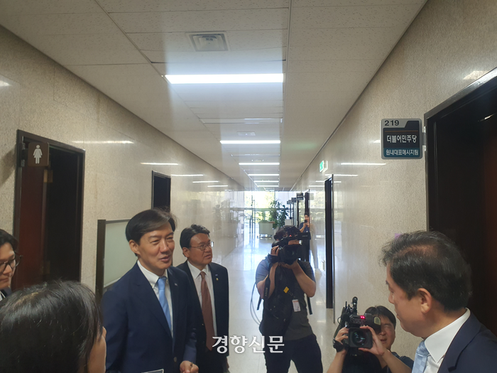 걸음을 옮겨 진보당의 사무공간인 221호·222호와 승강기 앞 긴 복도를 지나치자 혁신당의 또다른 사무실인 219호가 나타났다. 219호 역시 화장실을 마주하고 있었다. 조 대표는 219호 앞에 서서 “화장실 앞으로 대표실과 원내대표실을 배치했다. 두 공간을 분리해 놓고 이렇게 한 예가 없는데”라면서 머리를 쓸어넘겼다.