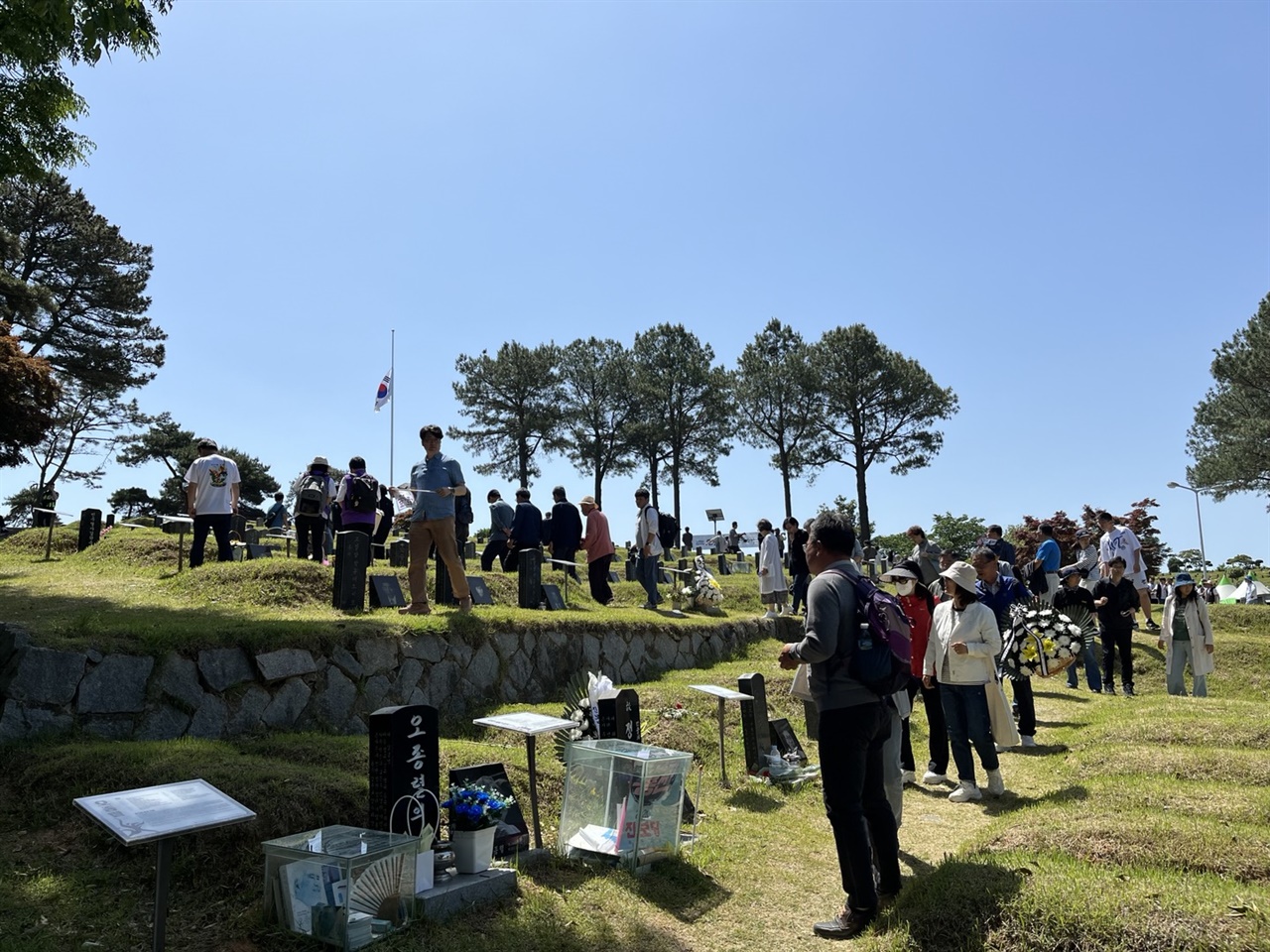 기념식의 주인공이 더는 유족이 아니었다. 정문을 통과하는 순간부터 지정된 자리에 앉을 때까지 정치인들 주변은 온갖 사람들로 들끓었다. 유튜버들의 스마트폰 앞에서 스스럼없이 포즈를 취하는 거물 정치인과 그들에게 다가가 눈도장 찍으려는 지방 의회 의원들의 행태가 눈살을 찌푸리게 했다. 추모식이 아니라, 마치 전당대회장을 방불케 했다.