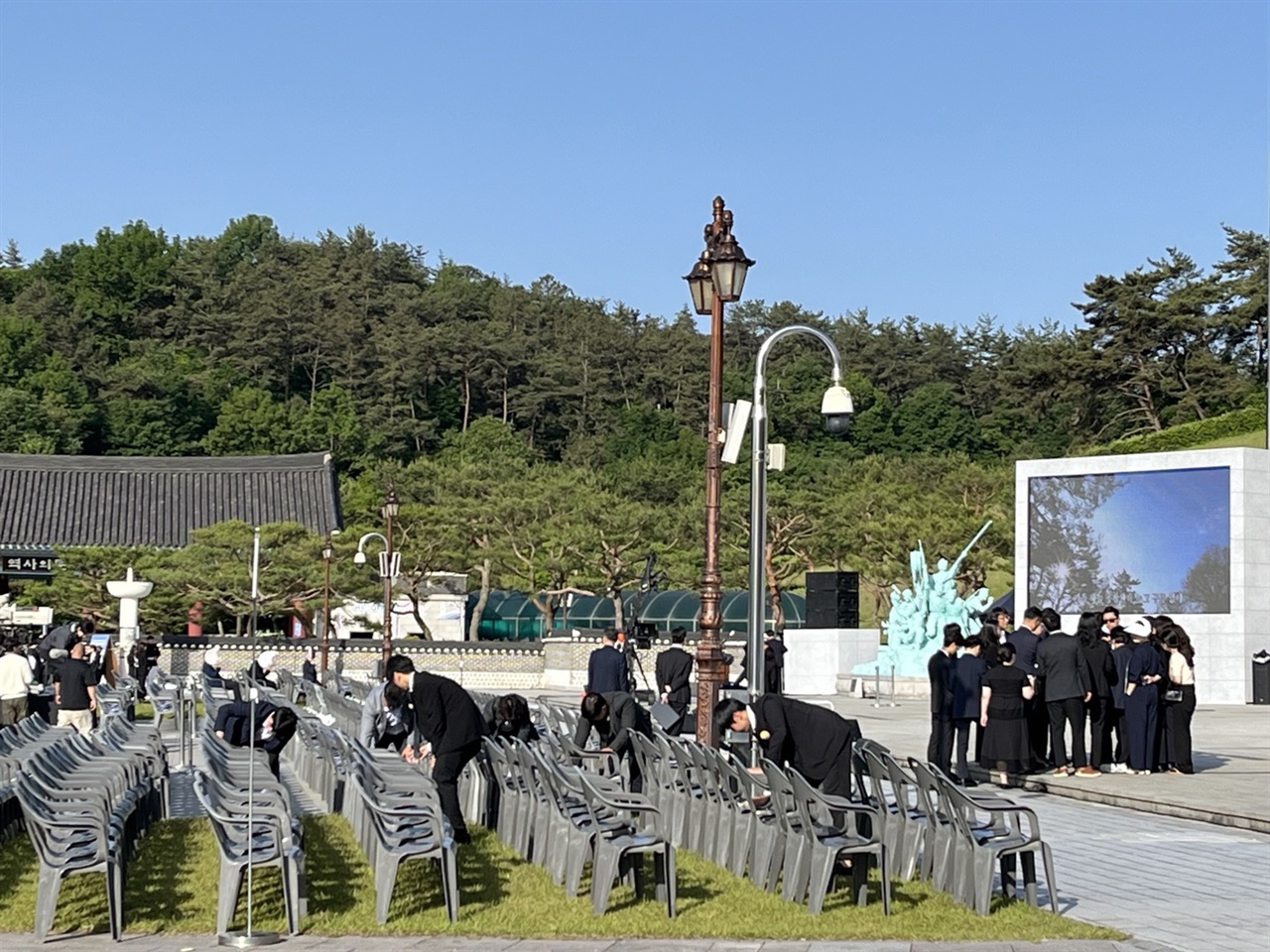 이윽고 낯익은 정치인들이 줄줄이 정문을 지나 기념식장으로 들어왔다. 소복을 입은 5.18 유족들과 노란 점퍼 차림의 세월호 참사 유족, 보라색 조끼를 입은 이태원 참사 유족들이 입장했을 때는 미동도 없던 이들이 여야 정치인들의 등장에 부나방처럼 몰려들었다. '보도' 완장을 찬 기자들과 스마트폰 거치대를 쥔 유튜버들이 뒤엉켜 이내 소란스러워졌다.