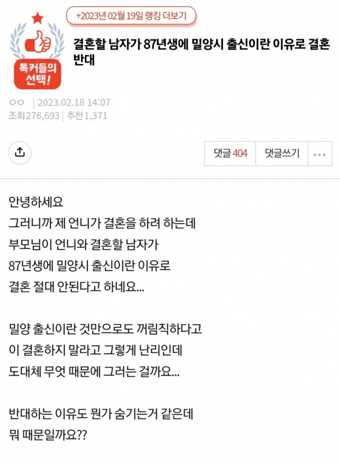 지난 해 한 온라인 커뮤니티에 올라왔던 "결혼 상대로 '87년생 밀양 출신 남성' 데리고 온 언니, 부모님이 반대합니다."라는 글이 재조명 되고 있다.