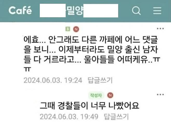 밀양 지역 전체로 확대되는 대중의 분노에 밀양 지역 한 맘카페에서는 아들을 둔 엄마들의 우려와 탄식이 쏟아져 나오고 있다. 커뮤니티 회원들은 쏟아지는 비판 댓글을 언급하며 미혼인 자녀가 행여 안 좋은 시각으로 비칠지 고민하고 있다.