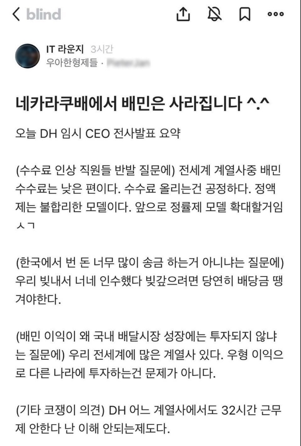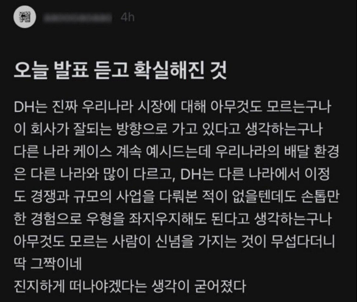 한 배민 직원은 “DH는 진짜 우리나라 시장에 대해 아무것도 모르는구나. 다른 나라 예시를 계속 드는데 우리나라의 배달 환경은 다른 나라와 많이 다르다”며 “진지하게 (회사를) 떠나야겠다는 생각이 굳어졌다”고 토로했다.