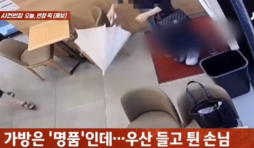 공개된 해당 영상 속 손님 일행은 자리에서 일어나 우산 통으로 향한다. 명품 가방을 멘 손님이 우산 하나를 집어 든 후 이리저리 상태를 확인하더니 아르바이트생을 쳐다보고는 그대로 우산을 가지고 밖으로 나간다.