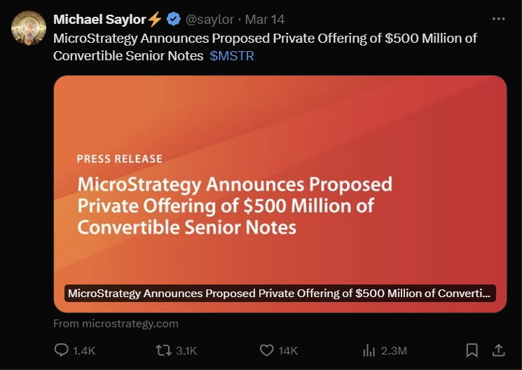 지난 11일 전환사채 조달 자금으로 비트코인 매입을 발표한 마이클 세일러 마이크로스트래티지 회장의 트윗은 280만 조회수를 기록했고, 추가적인 가격 상승을 기대하는 투자자들의 댓글 행렬이 이어졌다. 가상자산 커스터디 업체 ‘온램프비트코인’의 제시 마이어스(Jesse Myers) 최고운영책임자(COO)는 X를 통해 “마이크로스트래티지는 가치가 떨어지는 자산을 빌려 가치가 오르는 자산을 구입한다”라고 긍정적으로 평가하기도 했다.
