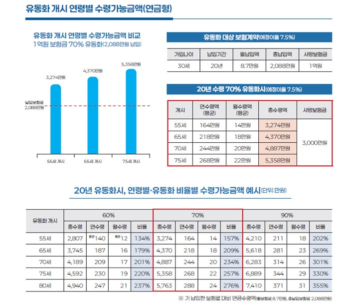 만약 30세부터 20년 동안 매월 8만 7000원씩 총 2088만 원을 납입해 사망보험금 1억 원 보험계약을 보유한 가입자가 3000만 원만 사망보험금으로 남겨놓고 55세부터 연금으로 당겨받는 경우 월 평균 14만 원을 수령할 수 있게 된다. 연금 수령 시점을 75세로 늦출 경우 월 22만 원으로 늘어난다.