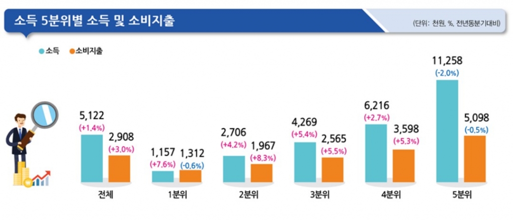 한편 지난 1분기에 명목소득이 가장 많이 늘어난 소득계층은 1분위(7.6%)다. 소득 하위 20%인 1분위는 사업소득이 3.6% 감소했지만 근로소득(6.6%)과 이전소득(9.4%)이 증가했다. 이전소득이 늘어난 것은 기초생활보장제도의 보장성이 강화된 것과 무관하지 않다. 2분기(4.2%)와 3분위(5.4%), 4분위(2.7%)의 소득도 늘었다. 5분위는 2.0% 감소했다.