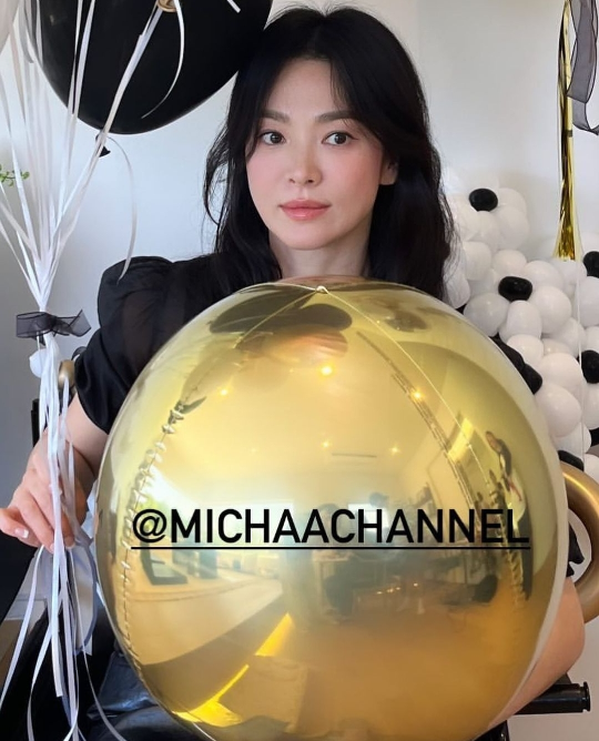 배우 송혜교는 4일 자신의 개인 채널을 통해 팬들에게 근황을 알렸다. 공개된 사진에서 그녀는 검정색 상의를 입고, 다양한 색상의 풍선들로 장식된 배경 앞에 서 있다.