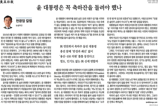 천 논설주간은 “윤 대통령이 축하주를 돌린 날은 22대 국회가 임기를 시작하는 첫날이었다”며 “108 대 192. 집권여당의 기록으로는 사상 유례가 없는 참패를 하는 바람에 거대 야당의 '재가' 없이는 웬만한 법안 하나 들이밀 수 없는 게 지금 윤 대통령과 여당의 처지다. 국민에게 약속한 수많은 공약과 개혁 다짐의 무거움을 조금만 생각했다면 '오늘은 제가 욕 좀 먹겠습니다'를 외치며 호기롭게 맥주캔을 들어 올리지는 못 했을 터”라고 했다.