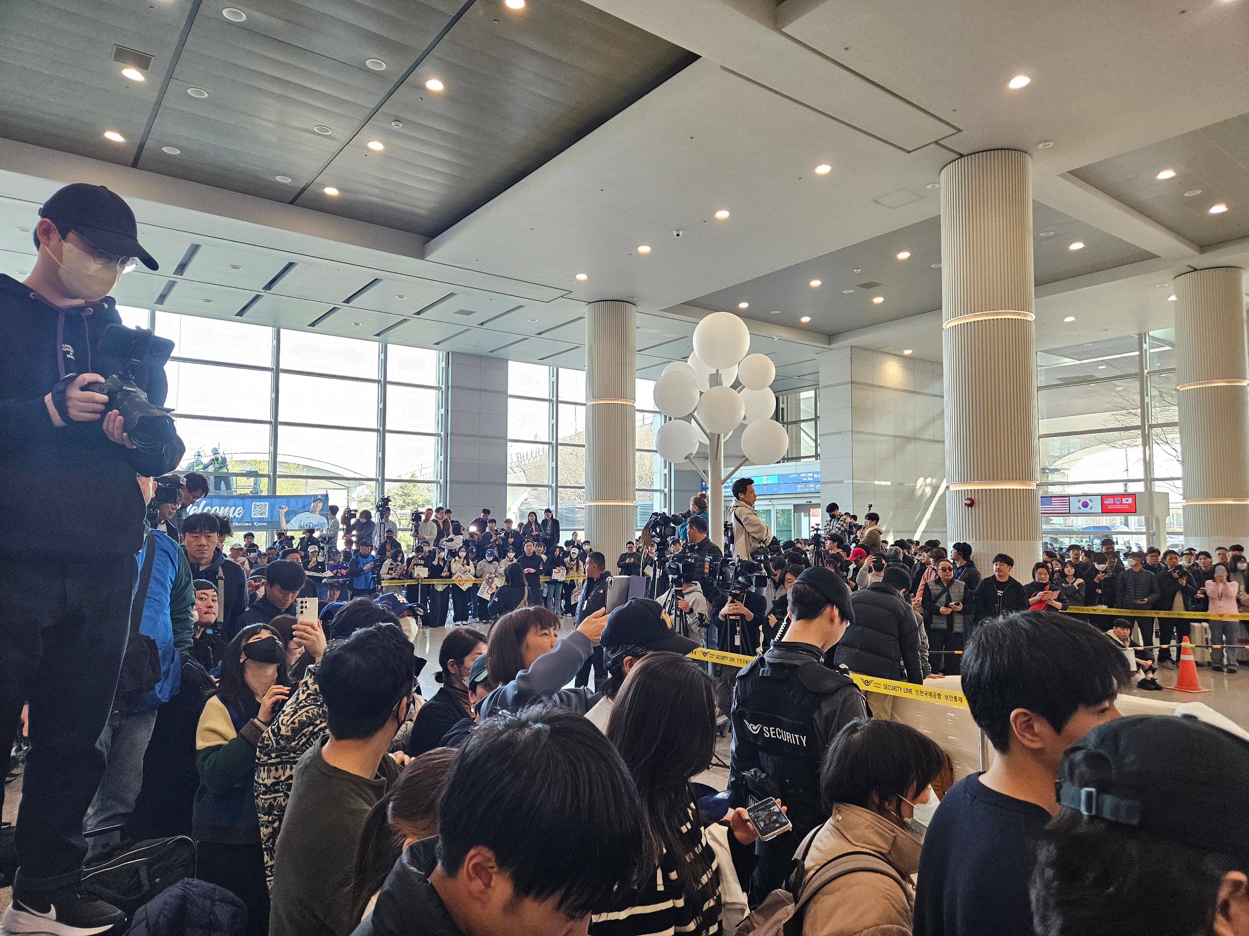 일본 오사카에서 현장을 찾은 미카미 유나(22)와 나나미(19) 자매도 “오타니는 일본에선 ‘신’ 같은 존재”라며 “관광 차 한국에 왔는데 마침 오타니가 방한한다고 해 그를 놓치기 싫었다”고 했다. 한국 취재진을 비롯해 AP 통신, 일본 NHK 등 다수의 국외 취재진도 다저스 선수단의 입국 장면을 담기 위해 ‘자리싸움’을 벌였다.
