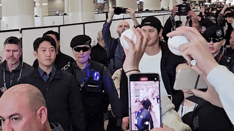 이날 선수단은 착륙한 뒤 약 10분쯤 지나 입국장에 나타났다. 가장 먼저 오타니가 등장하자 “레츠 고 쇼헤이. 레츠 고 다저스” 등 환영 구호가 쏟아졌다. 선수들은 장시간 이동에 따른 피로 때문인지 빠르게 발걸음을 옮겼지만, 팬들을 향해서 미소를 날렸다. 한국행 비행기를 타기 전 그동안 소문으로만 무성했던 아내를 공개한 오타니가 아내와 함께 모습을 드러낼지 관심을 모았는데, 오타니의 아내로 추정되는 다나카 마미코(28)는 수줍게 오타니의 뒤를 따라 들어왔다. 오타니 이후 그의 통역 미즈하라 잇페이(40), 타일러 글래스노우(31), 무키 베츠(32), 야마모토 요시노부(26) 등도 차례로 한국 땅을 밟았다.