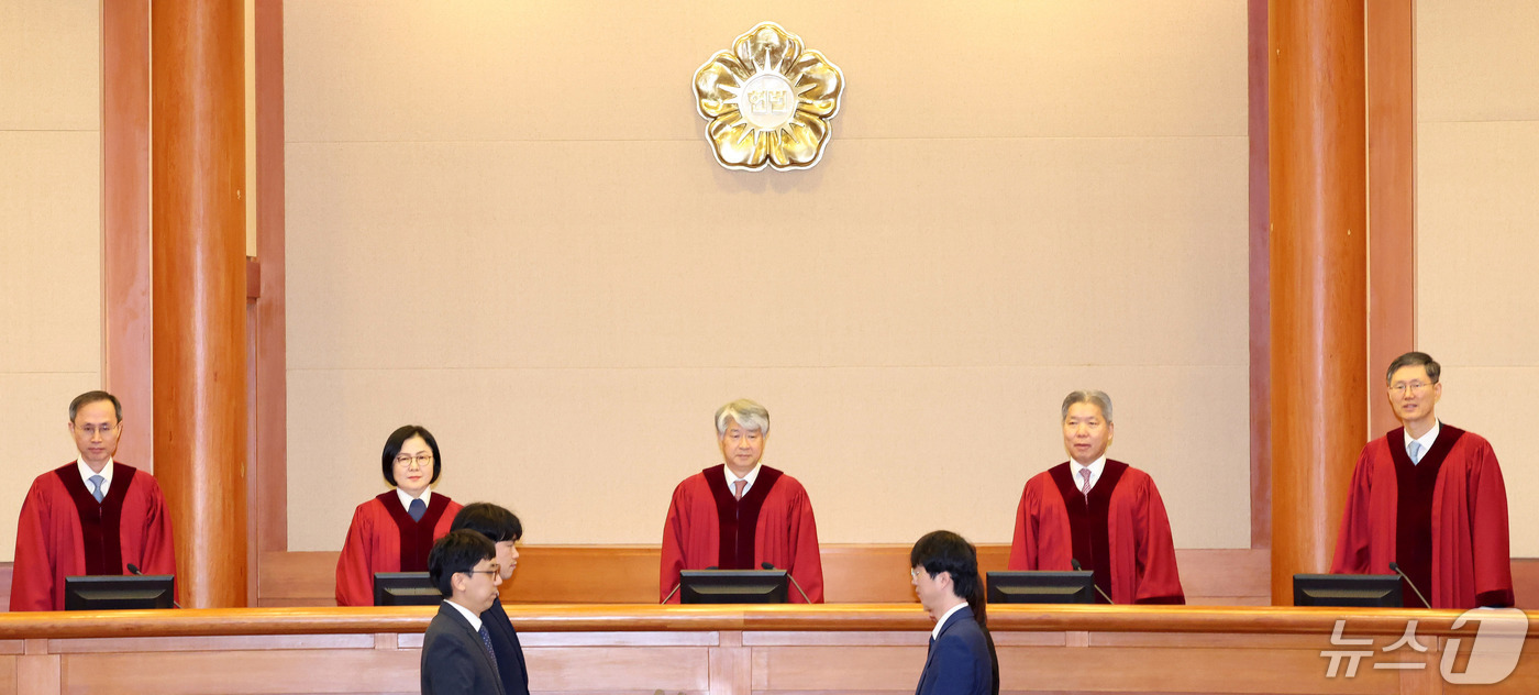 이종석 헌법재판소장(왼쪽 세 번째)을 비롯한 재판관들이 8일 오후 서울 종로구 헌법재판소 대심판정에서 열린 '이정섭 대전고검 검사 탄핵 사건 변론기일'에 입장하고 있다. 이 검사는 강촌 엘리시안리조트 이용 선후배 검사 특혜와 처남 마약 사건 특혜, 김학의 뇌물 사건 연루 등을 위반한 혐의를 받고 있다. (공동취재) 2024.5.8/뉴스1 ⓒ News1 신웅수 기자