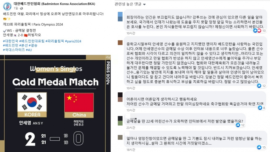 배드민턴협회가 페이스북에 올린 게시물에는 안세영과 그의 금메달 사진이 하나도 없었기 때문. 게시물에는 안세영이 올림픽 결승에서 중국의 허빙자오를 2대 0으로 꺾었다는 내용의 그래픽만 하나 공유돼 있다.