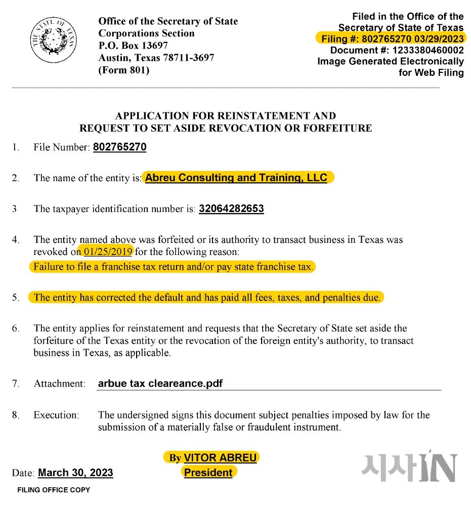 텍사스주 국무장관실에 제출된 이 서류의 제출자에는 지난 6월5일 한국에 입국한 액트지오의 비토르 아브레우 고문 이름이 ‘사장(President)’ 명의로 적혀 있다.