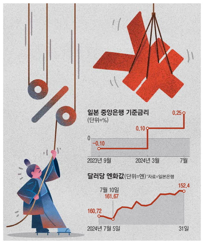 일본은행이 단기 정책금리를 올리면서 미·일 금리차에서 비롯된 '초저점'에도 변화가 예상됩니다. 지난 3월 17년 만에 마이너스 금리 정책을 접은 지 4개월 만에 다시 금리를 올린 데다 수입 물가를 통한 엔저 압력이 과도하게 작용한 것으로 보입니다.
