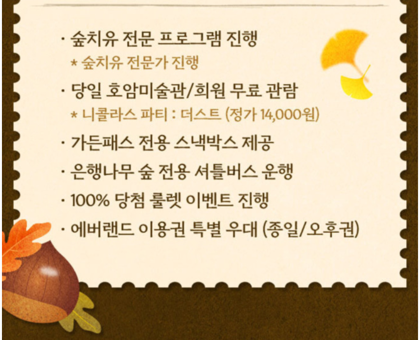 기간도 한정판이다. ‘비밀의 은행나무숲 산책’ 프로그램은 황금빛 은행나무 단풍이 가장 아름다울 것으로 예상되는 오는 10월25일부터 11월 10일까지 매주 금 토 일, 총 9일 동안 하루 3회씩만 진행된다.