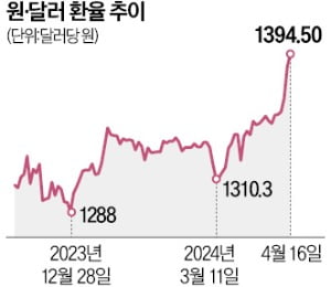 시장 전문가들도 환율 전망치를 높이고 있다. 박수연 메리츠증권 연구원은 “2분기 중 원·달러 환율이 1420원까지 오를 수 있다”고 밝혔다. 당국의 개입이 없다면 1450원대까지 오를 수 있다는 게 그의 생각이다.