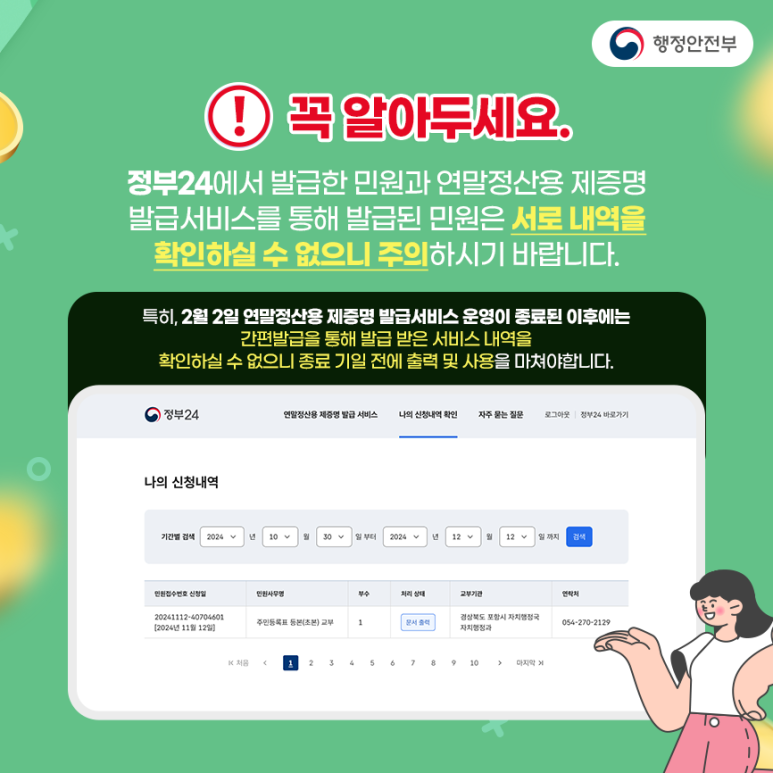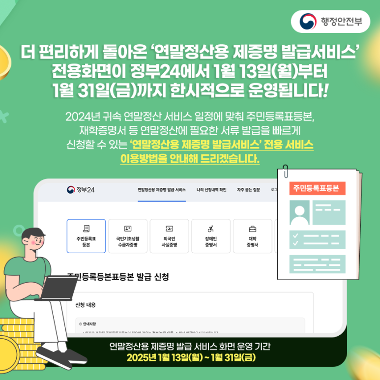정부 24에서 2025년 연말정산용 제증명 발급서비스를 1월 13일(월)부터 1월 31일(금)까지 한시적으로 운용합니다.