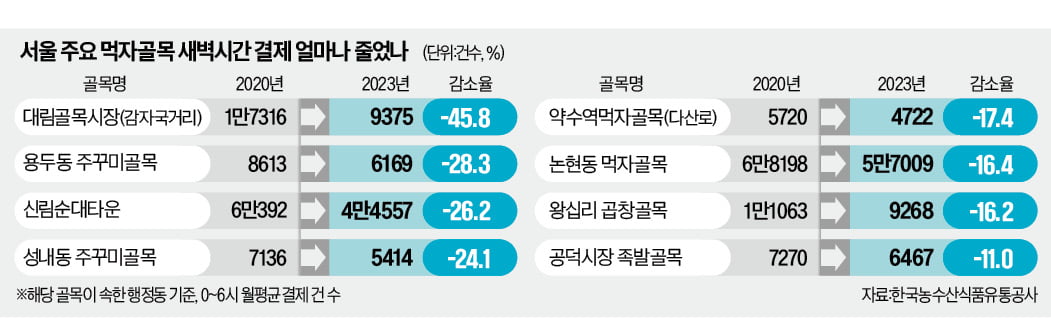 은평구 응암3동 ‘감자국 거리’(대림골목시장)의 2020년 새벽 시간 월평균 결제 건수는 1만7316건에서 지난해 9375건으로 거의 반 토막 났다. 신림순대타운이 있는 관악구 서원동의 새벽 시간 결제는 같은 기간 6만392건에서 4만4557건으로 26.2% 감소했다.