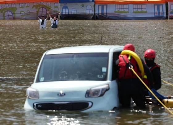 지난달 31일 오후 서울 강남구 탄천에서 안전한국훈련의 일환으로 풍수해 상황을 가정한 수습복구 훈련이 펼쳐지고 있다. 연합뉴스