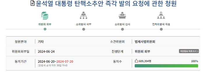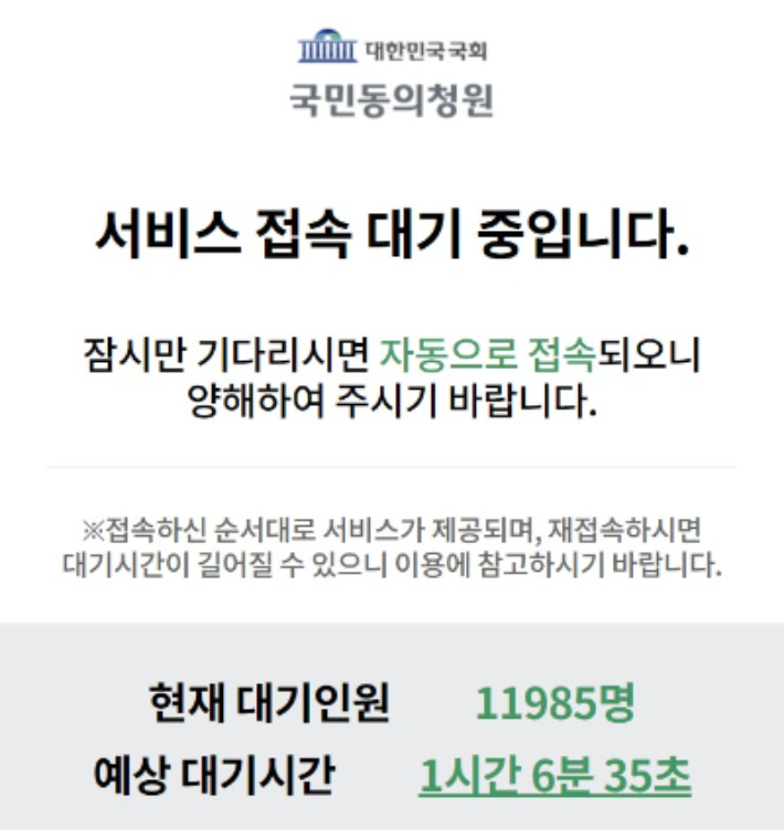 대한민국 국회 국민동의청원 사이트에 올라온 '윤석열 대통령 탄핵소추안 즉각 발의 요청에 관한 청원'은 29일 오후 5시 기준까지 총 60만 9394명이 동의했다. 현재 청원 사이트에는 1만 2천 명에 가까운 대기인원이 몰리면서, 예상 대기시간이 1시간에 달하는 등 접속 지연이 빚어지고 있다.