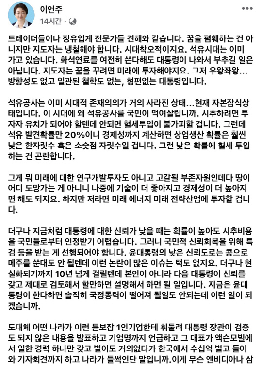 이언주 더불어민주당 의원이 6일 '경북 포항 영일만 석유·가스 매장 가능성과 탐사 시추 계획 승인'을 발표한 윤석열 대통령을 재차 비판했다.