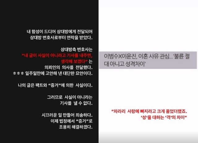 이후 곧바로 새로운 게시물을 통해 '이범수X이윤진, 이혼 사유 관심…'불륜 절대 아니고 성격차이'라는 기사 헤드라인을 캡처한 후 "차라리 사랑에 빠지라고 크게 품었더랬죠. '성'을 대하는 '격'의 차이"라고 폭로했다.