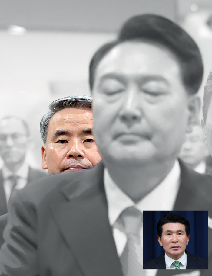 지난해 9월 대통령실 청사에서 열린 국무회의에서 윤석열 대통령과 호주대사로 부임한 이종섭 전 국방부 장관이 국기에 경례를 하고 있다. 작은 사진은 황상무 대통령실 시민사회수석. 경향신문 자료사진