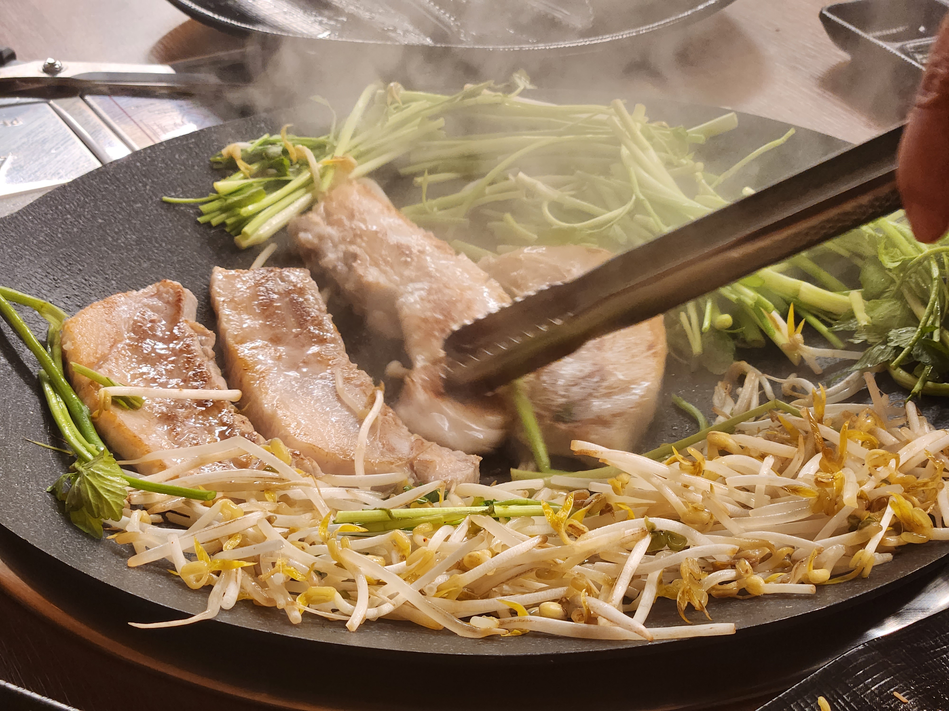 미나리 숙주 고사리 김치까지 삼겹살 기름에 지글거리게합니다.