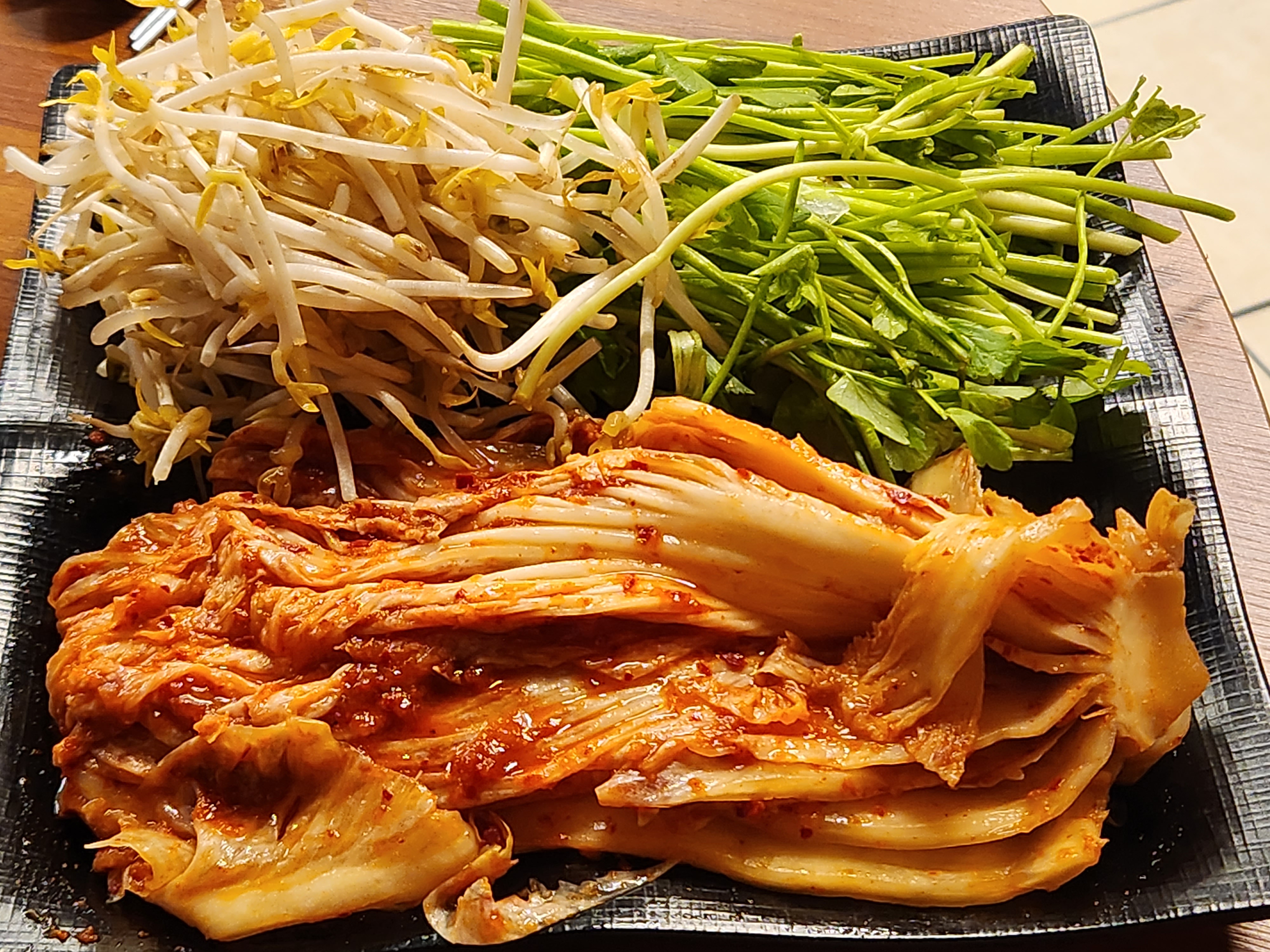 생삼겹살을 주문했더니 미나리와 숙주 김치가 나왔어요.