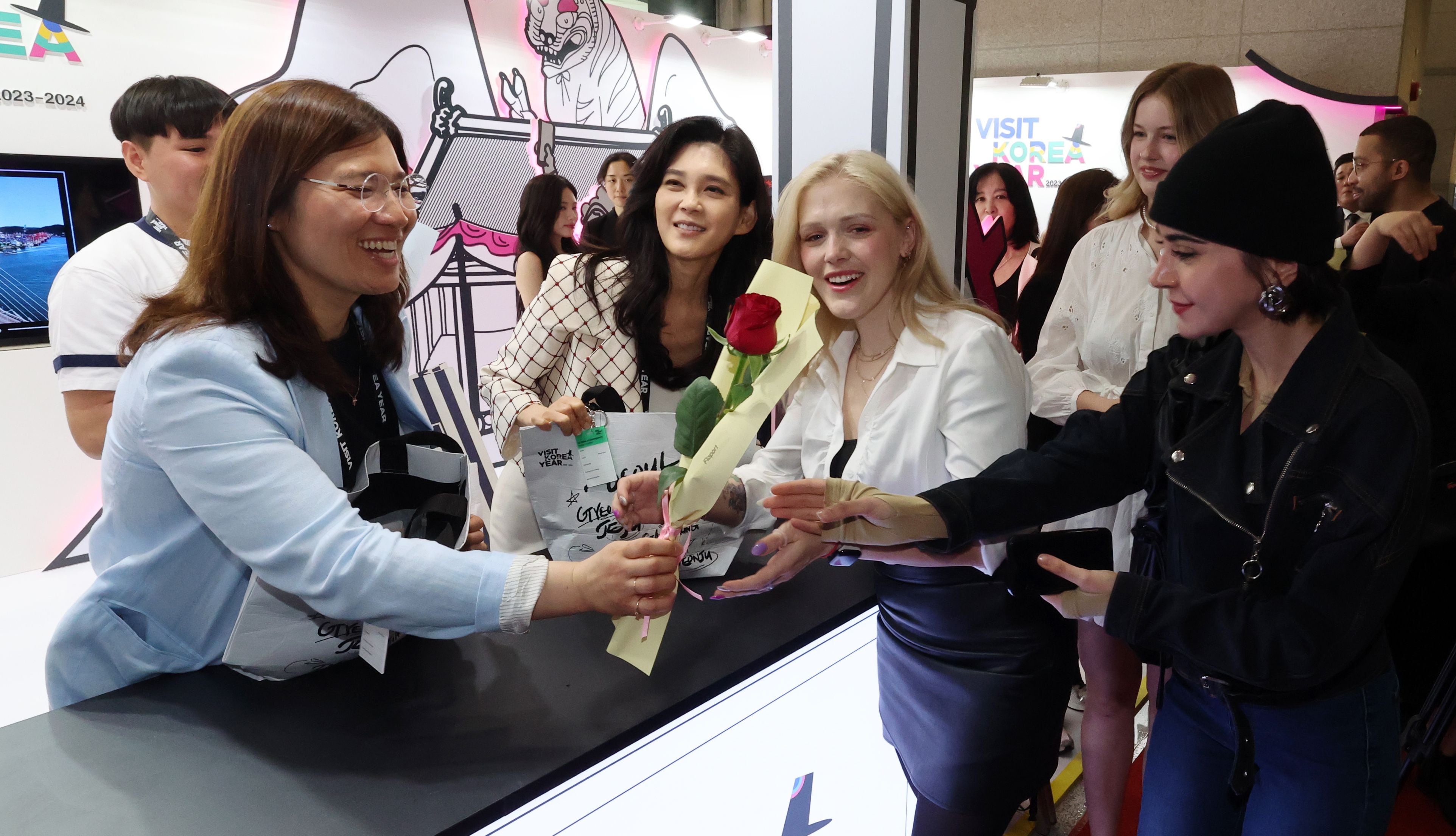 장미란 차관과 이부진 위원장은 이날 환영부스에서 외국인 관광객들에게 주요 국내 관광지와 맛집 등 여행 정보를 알려주고 기념사진도 찍었다.