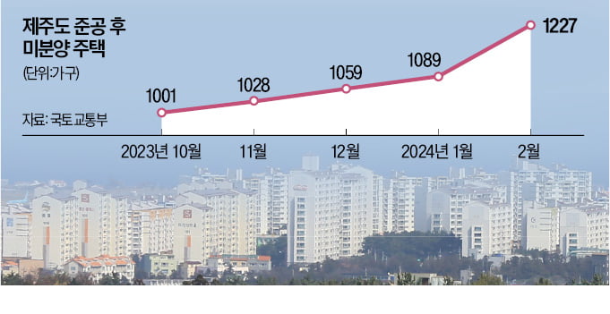 9일 국토교통부에 따르면 지난 2월 기준 제주도의 준공 후 미분양 주택은 1227가구로 집계됐다. 1월(1089가구)에 비해 138가구 늘며 역대 최고치를 갈아치웠다. 작년 2월(762가구)과 비교하면 1년 새 61% 증가했다. 지난 2월 전국 준공 후 미분양 주택은 1만1867가구다. 제주 지역 인구(67만3600명)는 국내 전체의 1.3%에 불과하지만, 준공 후 미분양 주택이 차지하는 비율은 전국의 10.3%나 됐다.